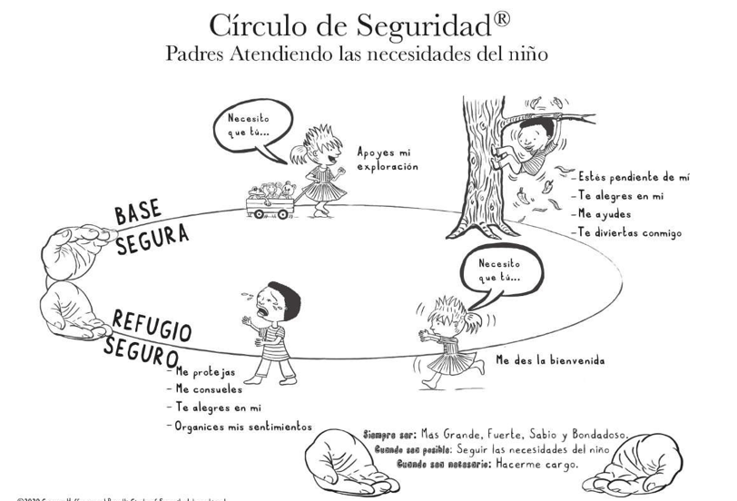El círculo nos sirve como mapa, como guía para poder interpretar esas necesidades y ver qué puede necesitar nuestro hijo de nosotros en cada momento. Fomenta la seguridad infantil, el desarrollo y la gestión emocional que el niño necesita de su cuidador para poder desarrollar un vínculo seguro.